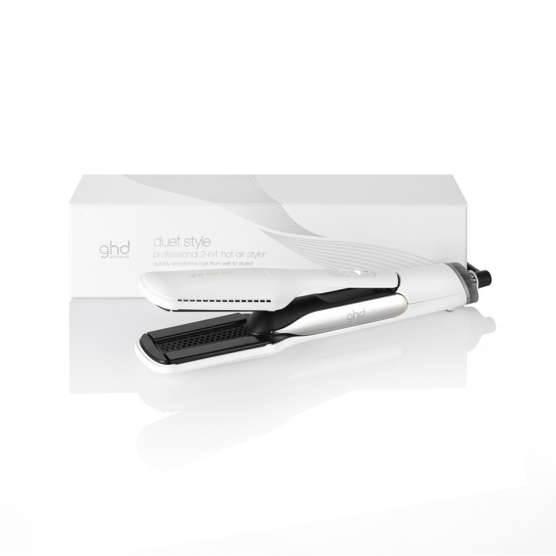 Le Duet Style blanc de ghd est un lisseur séchant 2-en-1*. Il s'agit de LA révolution électro-beauté ! Cet appareil sèche et lisse simultanément les cheveux mouillés sans dommage thermique**.