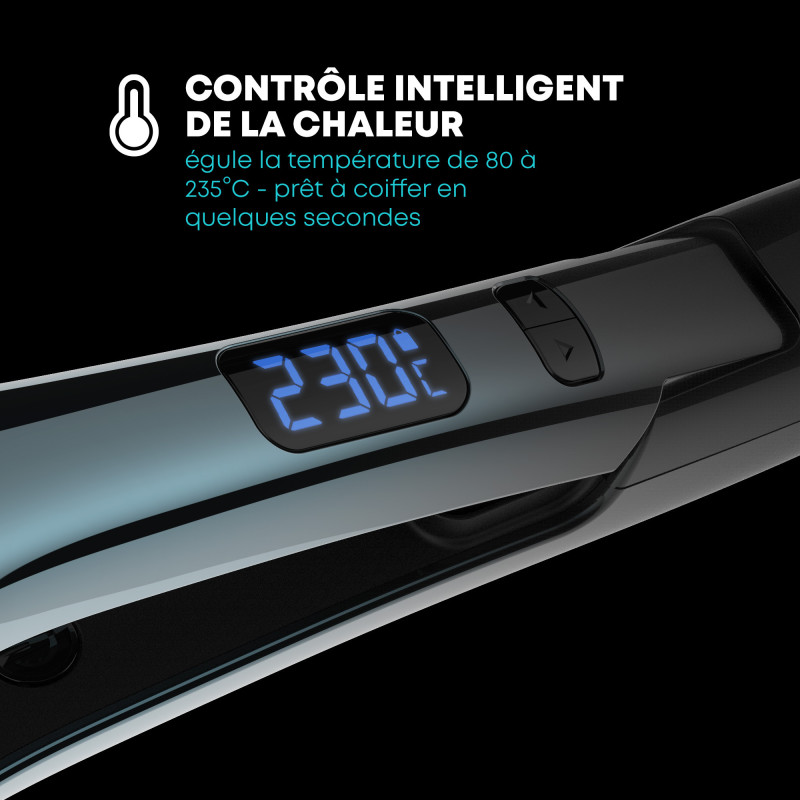 Le lisseur propose une large plage de température réglable, allant de 80°C à 235°C, ce qui le rend adapté à tous les types de cheveux, des plus fins aux plus épais. Une fois la température sélectionnée, elle peut être verrouillée pour un coiffage constant et sûr. De plus, la technologie PTC assure une chauffe ultra-rapide pour un coiffage en un temps record.