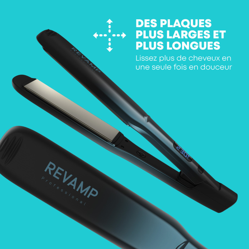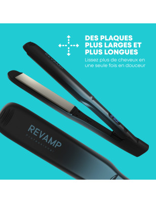 Le Lisseur Extra Large X Brillance Progloss™ de Revamp Professional est l’outil idéal pour les personnes cherchant à styliser rapidement de longues mèches de cheveux. Il est doté de plaques flottantes en céramique mesurant 38 mm de large et 125 mm de long, ce qui permet de couvrir une plus grande surface capillaire en moins de temps.