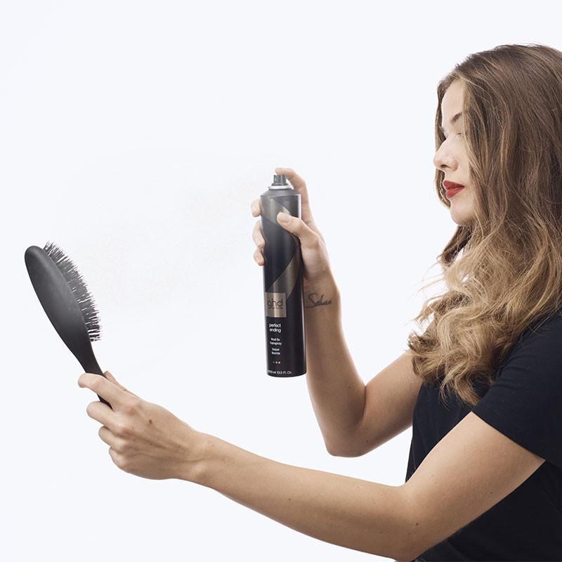 La laque perfect ending de GHD permet de fixer durablement les cheveux et surtout elle résiste à l’humidité.